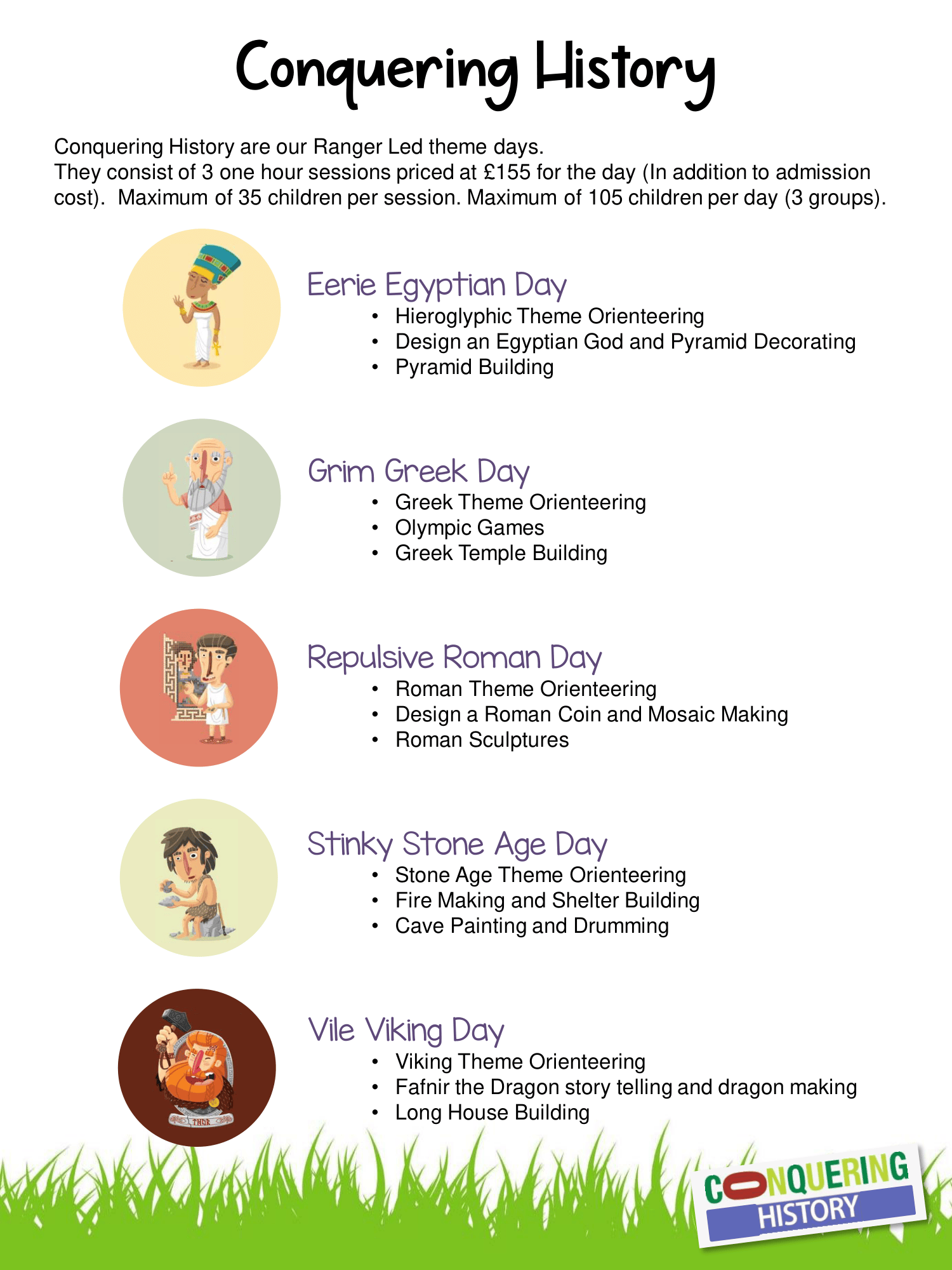 CONKERS is offering KS2 children the opportunity to learn more about Vikings, Romans, Greek, Egyptians and Stone Age through a range of interactive workshops. We are extremely excited to be able to offer a mix of theme days and dates for you to choose from!