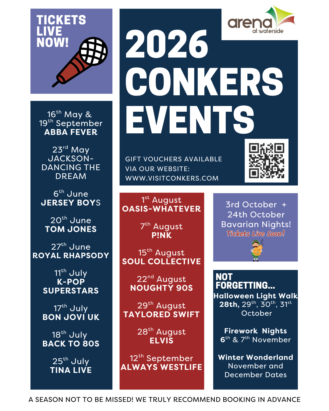 Our live music events are held in our covered amphitheatre – The Arena at Waterside or away from the winter chills in the CONKERS Discovery Hall.