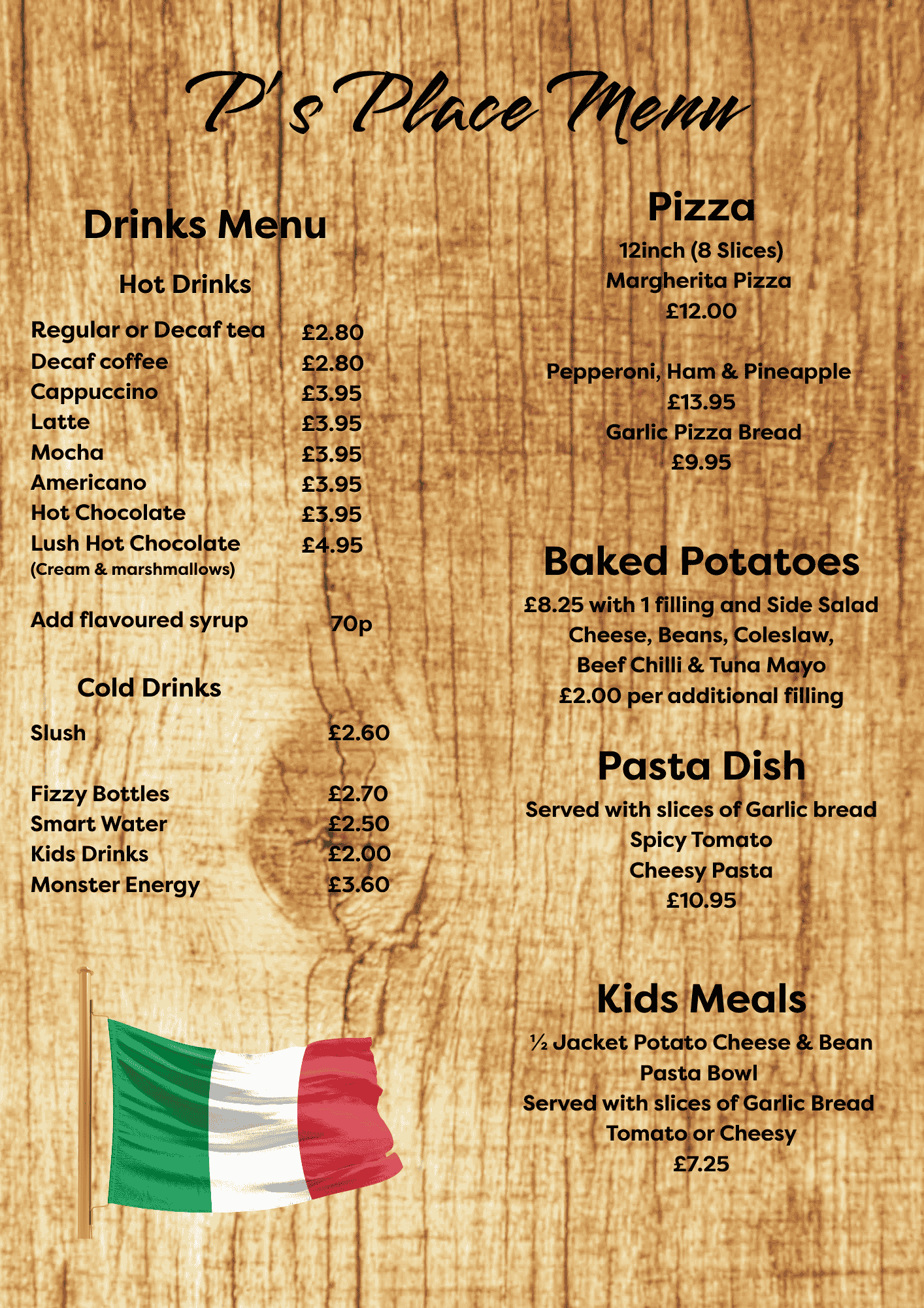 P’s Place is situated by the side of Watersides lake, providing a beautiful view for visitors to enjoy, serving Pizza, Pasta and Delicious Jacket Potatoes!